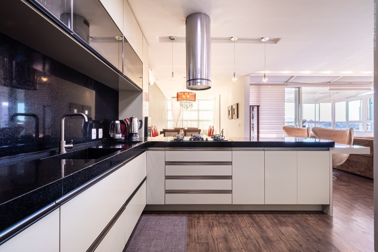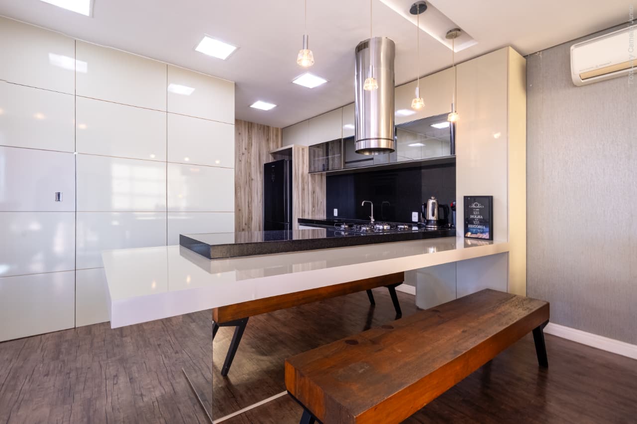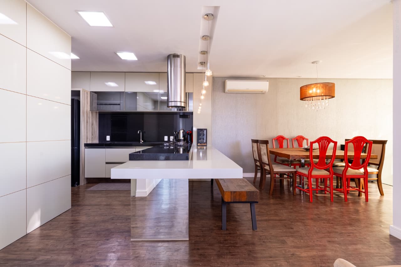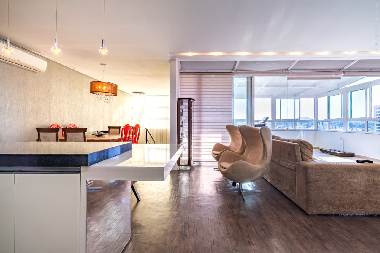 sala de TV/sala de jantar integradas a cozinha;
